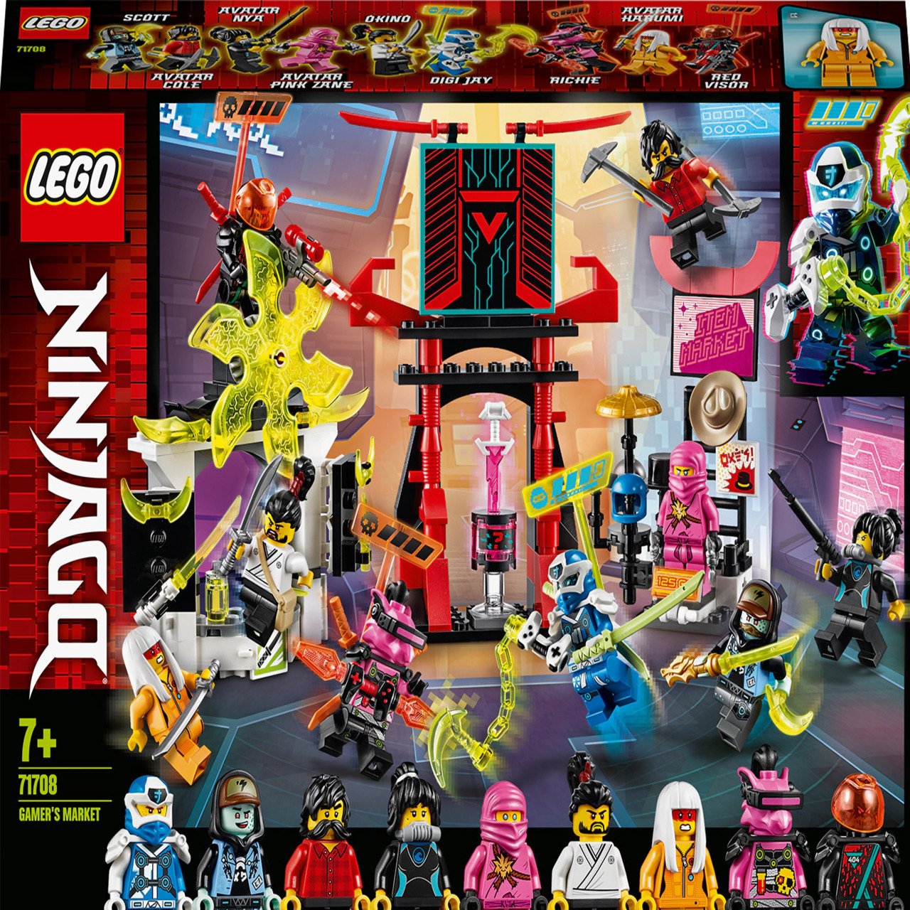 - Dieses Bauset enthält 9 Minifiguren, darunter auch die NINJAGO Helden Digi Jay, Avatar Nya und Avatar Cole sowie Pink Zane und Harumi als exklusive Figuren. Auf dem Gamer Marktplatz gibt es eine Ausrüstungsbude und einen Hütestand für die NINJAGO Figuren, die den Rahmen für spannende Geschichten bilden können.
