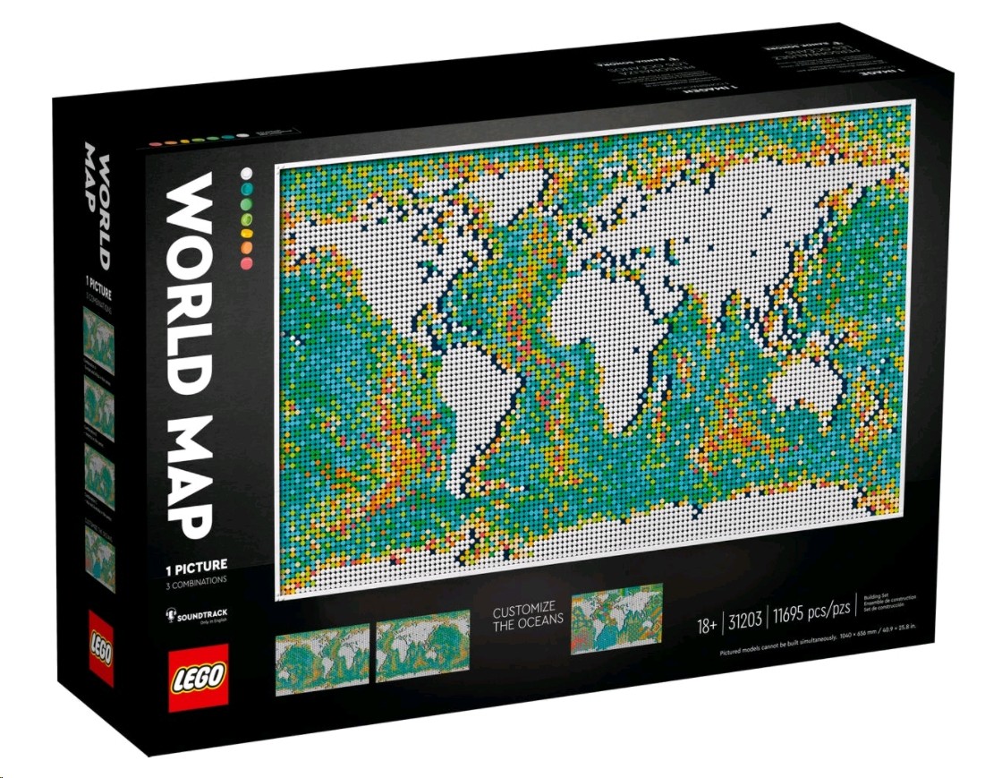 Wolltest du schon mal eine eigene Weltkarte gestalten? Diese riesige LEGO® Art Weltkarte (31203) bietet dir genau diese Möglichkeit. Mit diesem bisher grössten LEGO Set kannst du 1 von 3 möglichen Varianten der Weltkarte bauen und aufhängen.