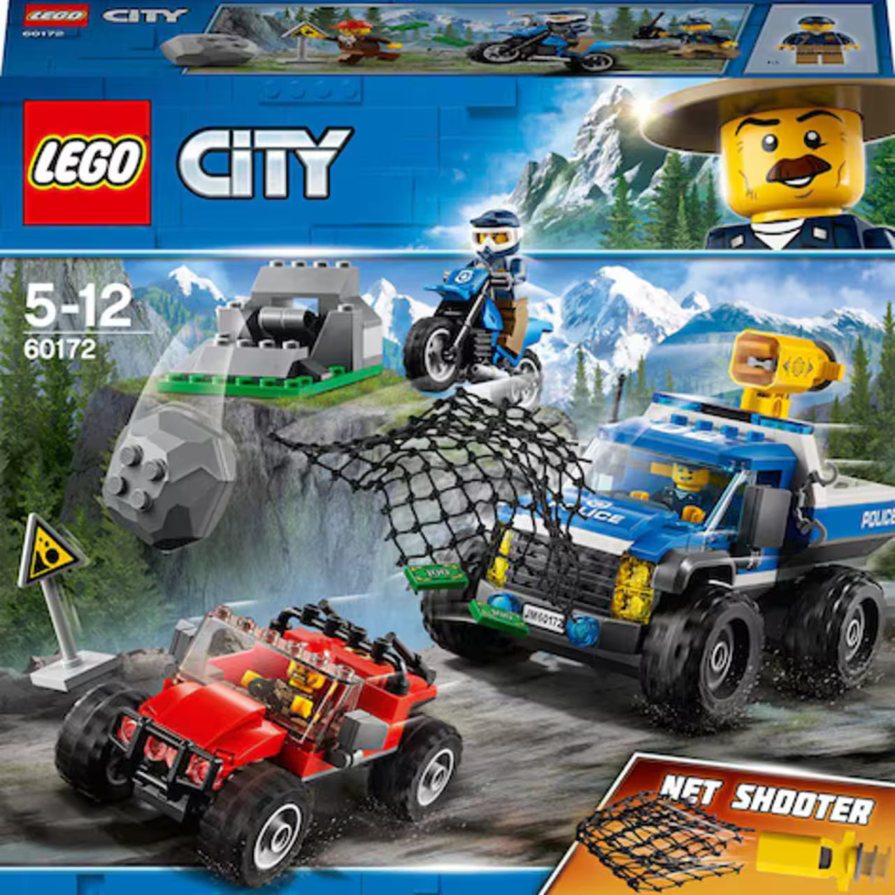 Hol deine Marke und begleite die LEGO City Bergpolizei auf Verfolgungsjagd auf Schotterpisten! Dieses spannende Set enthält einen Polizei-Quad mit Sitzen für Minifiguren, einen Netzwerfer, ein Polizei-Motocross-Motorrad,