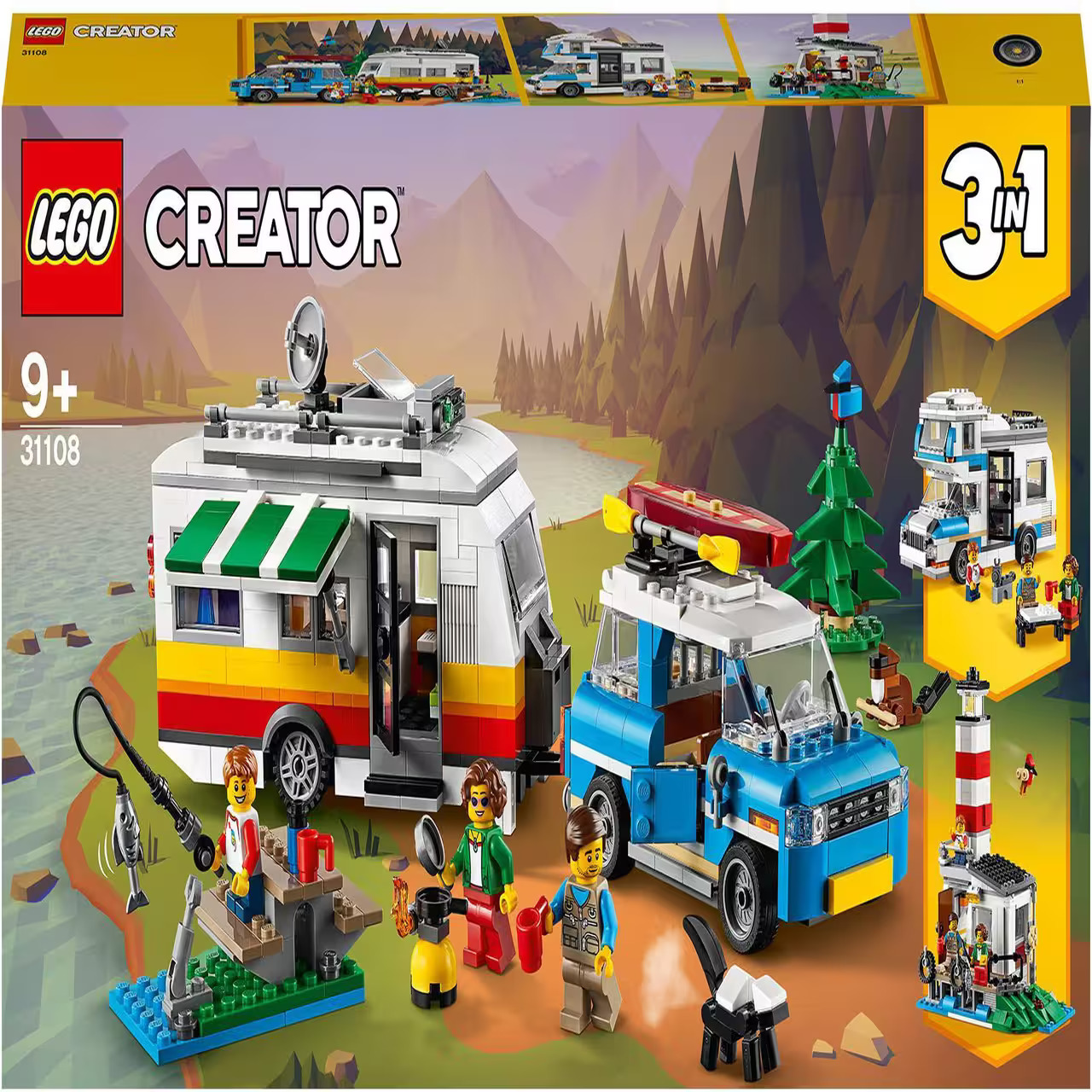 Das LEGO Creator 3-in-1-Spielset Campingurlaub (31108) bietet Kindern 3 Spieloptionen mit dem Wohnwagen und dem Auto, dem Wohnmobil und dem Leuchtturm. Das Set enthält ausserdem 3 Minifiguren und 3 verschiedene Tiere aus LEGO Steinen, die zusätzlichen Spielspass bieten. Fans kreativer Bau- und Spielerlebnisse werden dieses starke Set lieben. Das detailreiche Gespann aus Wohnwagen und Auto in Retro-Optik, das Wohnmobil und der Leuchtturm sind ein tolles Weihnachts- oder Geburtstagsgeschenk für Jungen und Mädchen ab 9 Jahren.