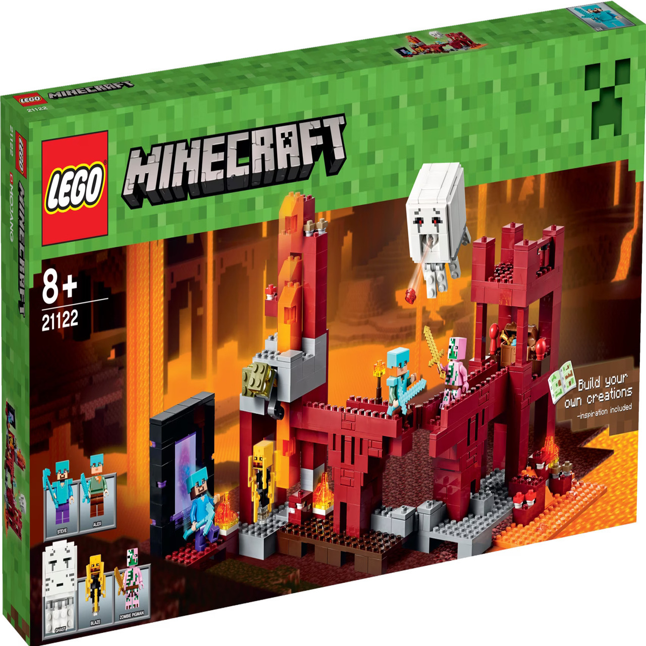 Nimm es an der Netherfestung mit den feindseligen Mobs auf! Dir gehen langsam genau die Vorräte aus, die die Oberwelt nicht zu bieten hat. Beleuchte das Obsidian-Portal und geh hindurch, um die Netherfestung zu erreichen. Dieses abweisende Bauwerk wird von diversen feindseligen Mobs beschützt. Hilf Alex, Blaze zu besiegen, der die Festung bewacht. Nimm deine Diamant-Spitzhacke und grabe nach Glühstein, um unterwegs eine Lichtquelle zu haben. Doch pass bloß auf, dass du keinen Lavastrom auslöst! Baue einen Zugangspunkt, um die Festungsmauer zu durchbrechen, greif dir dein Diamant-Schwert und starte einen Überraschungsangriff auf den Zombie Pigman. Nimm es mit dem rotäugigen Ghast auf, der mit Feuerbällen schießt, um dir die Truhe zu holen, die 2 Diamanten und ein goldenes Schwert enthält, sammle Pilze und Netherwarzen und grabe nach Netherquarz-Erz. Das ganz normale Tagwerk eines echten Helden aus LEGO® Minecraft®! Baue weitere LEGO® Minecraft Kreationen mit dem Set! Enthält 3 Minifiguren mit Ausrüstung und Zubehör: Steve, Alex und einen ZombiePigman sowie Blaze und Ghast als weitere Figuren. – Enthält 3 Minifiguren mit Ausrüstung und Zubehör: Steve, Alex und einen Zombie Pigman sowie Blaze und Ghast als weitere Figuren. – Enthält ein Netherportal mit Leuchteffekt, 2 Glühstein-Elemente zum Zusammenbauen, die im Dunkeln leuchten, Ghast mit wechselndem Gesichtsausdruck und Feuerball-Abschussfunktion, eine Funktion, um Lava fließen zu lassen, 3 tragbare und aus Steinen baubare Feuer, Pilze und Netherwarzen als weitere Elemente, 2 aus Steinen zusammenbaubare Netherquarz-Erze sowie eine Truhe mit 2 Diamanten – Für die Brücke kann ein Winkel von 90 oder 180 Grad gewählt werden, um die Festung auch anders bauen zu können. – Ausrüstung: 3 Schwerter und eine Spitzhacke – Enthält 571 LEGO® Teile – Lass deiner Fantasie freien Lauf! – Erlebe größten Spielspaß mit der Netherfestung! – Benutze den im Dunklen leuchtenden Glühstein als Lichtquelle! – Löse den Lavastrom aus! – Schieß Feuerbälle aus Ghasts Mund ab! – Baue deine eigenen LEGO® Minecraft Kreationen! – Das ideale Ge schenk für alle Fans von LEGO® und von Minecraft – Baue weitere LEGO® Minecraft Kreationen mit dem Set! – Das Modell ist 18 cm hoch, 40 cm breit und 12 cm tief. – Kombiniere dieses Biom mit anderen Biomen aus der Serie und erschaffe deine eigene LEGO® Minecraft Welt.