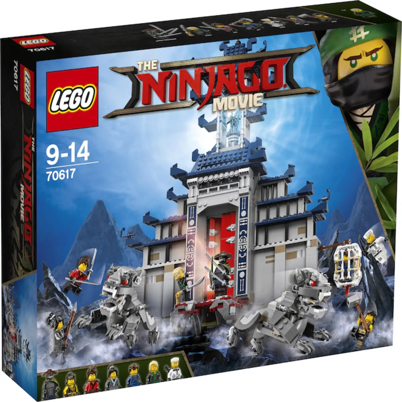 grosse Haupteingangstüren, eine Falltür, Funktionen, um Felsen herabstürzen und Dynamit hinunterfallen zu lassen, ein Verlies mit einem geheimen Eingang/Fluchtweg, eine Bücherei mit einer Schriftrolle und einem verborgenen Klingenshooter (verschiesst als Klingen verzierte Scheiben), einen Raum mit einem goldfarbenen Schwert und Schwert-Falle, einen Abstellraum mit einem Schwert und einer baubaren Vase, 2 Dachkammern, einen hängenden Käfig für eine Minifigur, eine Signalleuchte mit durchsichtig-blauer Flamme, ein herausziehbares Segment mit Stämmen, zwischen denen die Minifiguren hin- und herhüpfen können, um zur Schatztruhe zu gelangen, eine Statue sowie diverses Zubehör wie zum Beispiel ein Skelett, eine Spinne und 2 Schlangen. Lass den Felsen hinunterfallen, um eine Minifigur umzustossen, und dreh dann das Rad, um die Kette wieder hinaufzuziehen und den Felsen für seinen nächsten Einsatz bereit zu machen! Drück den Hebel, um den geheimen Eingang/Fluchtweg im Verlies zu öffnen. Aktiviere den unter der Schriftrolle verborgenen Klingenshooter, um eine Minifigur umzustossen. Dreh das Rad, um die Schwert-Falle zuschnappen zu lassen und eine Minifigur umzustossen. Zur Ausrüstung gehören die beiden Katanas von Kai, Nyas quastenbesetzter Speer, Coles Hammer, Zanes Pfeil und Bogen, Lloyds quastenbesetztes chinesisches Schwert, Jays Morgenstern sowie Dschungel Garmadons 4 Schwerter. Das Zubehör umfasst unter anderem Kais Schwertholster und Zanes Köcher. Stell die Szenen aus The LEGO NInjago Movie als spannende Rollenspiele nach. Das ultimativ ultimative Tempel-Versteck ist 49 cm hoch, 38 cm breit und 28 cm tief. Die Tempelwächter sind jeweils 10 cm gross.